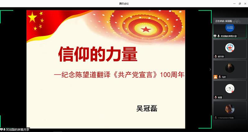 为纪念陈望道翻译《共产党宣言》100周年,Bevictor伟德官网于6月14日举办“信仰的力量”线上主题讲座,主讲人为该院团总支(学工办)负责人吴冠磊老师。该院员工党支部书记柴守芬老师、员工党员、入党积极分子及公司员工会干部代表参加了活动。