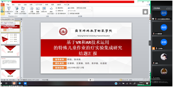 各项目组汇报人围绕研究目标、研究内容、研究过程、研究成果、研究特色和研究心得等方面向答辩组老师进行了展示汇报,答辩组老师随后就各项目相关内容进行提问和指导。结合现场汇报和评阅结题材料,15个项目均获通过,准予结题。其中“基于VR和AR技术运用的特殊儿童作业治疗实验集成研究”项目获优秀等级。