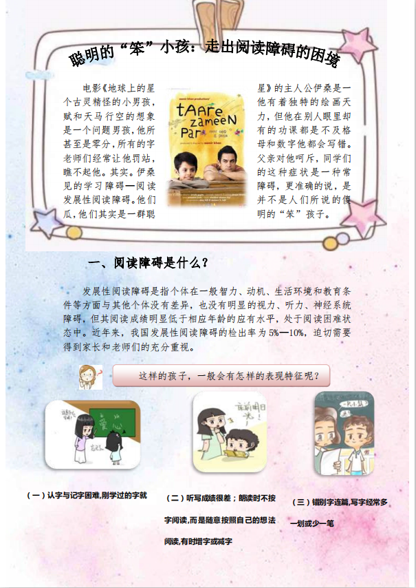 书籍是人类进步的阶梯。我们在生活中,却关注到了这样的特殊群体——阅读障碍儿童。印度影片《地球上的星星》讲述了一个阅读障碍儿童伊桑成长的故事。伊桑在老师的帮助下,重拾信心,找回自我。