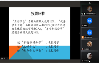 活动中,各班级坚持公平、公开、公正原则,对评选流程、投票细则都进行了详细地讲解。候选的同学从学习成绩、社会实践、志愿服务、班级工作等方面进行总结,分享感想,展示自身的魅力。候选的同学发言结束后,各班级分别通过班群,进行匿名投票,产生各班级的校三好员工、优秀员工干部、单项积极分子名单,报公司审核。