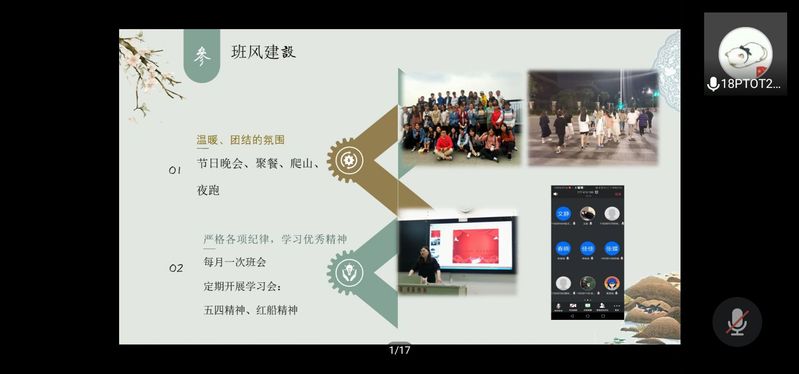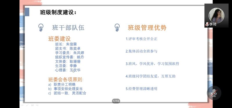 各班级通过各具特色的PPT、视频展示等形式,从班风学风建设、社会实践、志愿服务、制度建设、特色活动等方面汇报2019-2020学年的成绩,展示班级风采。18PTOT2班的志愿服务独具特色,18ST班的科技创新成绩斐然,1903班的学风建设卓有成效。