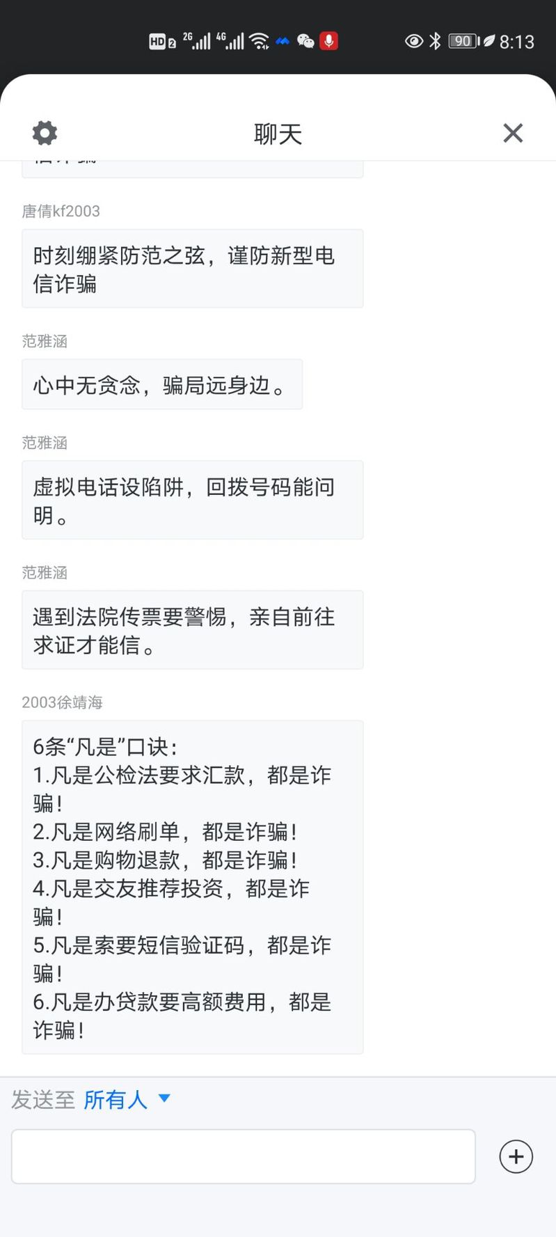 除了在班级QQ群中发布网络安全与防电信诈骗知识外,康复2002班组织班级同学在线观看防诈骗知识宣传小视频,邀请同学们结合自身经历“云”分享了有效防范电信诈骗的经验与方法。康复2003班组织同学们开展线上“防诈骗知识快问快答”的小游戏,以生动活泼的形式加强员工对防诈骗知识的理解与认识。康复2001、康复2005班和康复2006班还以宿舍为单位,认真学习老员工电信诈骗案例,进一步强化防骗意识。康复2004班则通过班委走访宿舍,宣传介绍由公安机关整理发布的电信网络诈骗常见案例,呼吁员工共同防范电信诈骗。