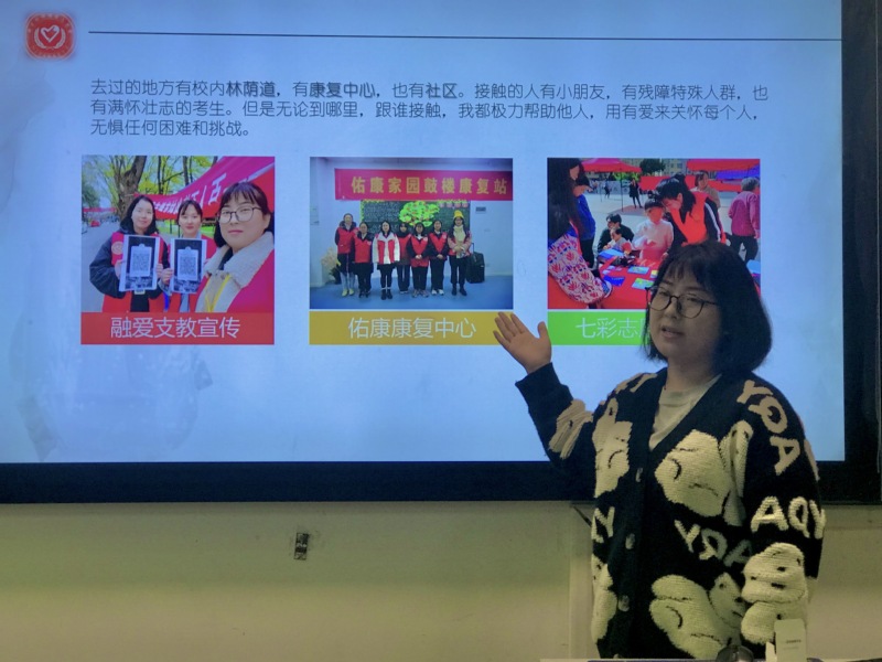 Bevictor伟德官网50名“殊博汇”志愿者参加评选。他们中有的同学热衷于志愿服务活动,一学年的志愿总时长达80多小时;有的同学从高中开始参加志愿活动,到了大学更是满怀激情,义无反顾地在志愿服务这条路上坚定地走下去。50名“殊博汇”志愿者用视频和PPT向现场的观众展示了志愿服务路上的付出、感悟与成长。