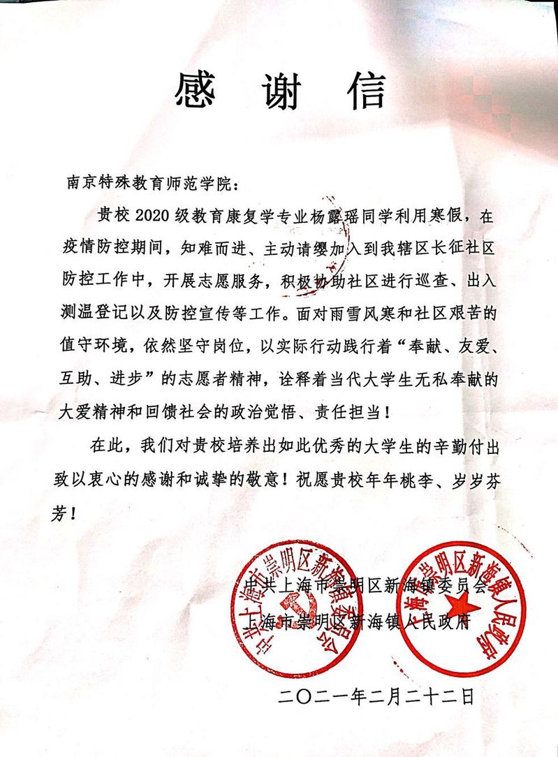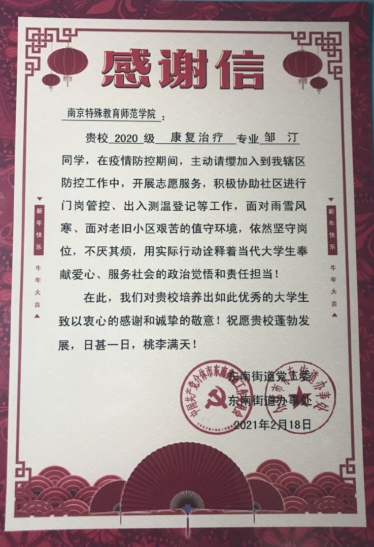 康复2004班的杨露瑶同学利用寒假,在疫情防控期间,主动请缨加入到新海镇长征社区防控工作中,开展志愿服务,积极协助社区进行巡查、出入测温登记及防控宣传等工作;康复2002班的邹汀同学在得知自己所在的社区缺少志愿者后,主动报名参加社区志愿防疫工作。2月9日开始在清源小区疫情防控卡点执勤,积极参与小区内重点区域和公共区域消毒工作并通过多种形式劝导群众积极防控。