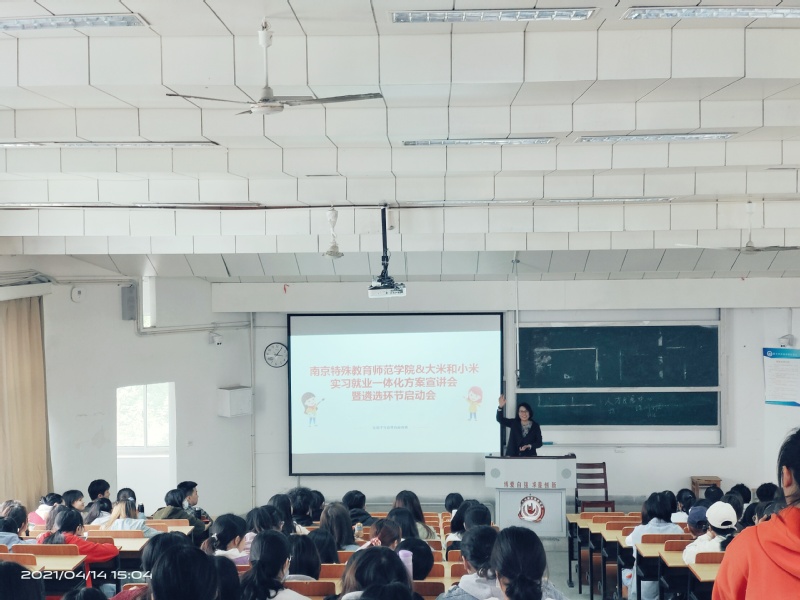 宣讲会首先由一段视频拉开序幕,视频简明概括了“大米和小米”的发展历史以及对行业发展前景的展望。接着,主讲人向在场的同学们详细宣讲了公司与“大米和小米”联合培养实习就业一体化方案,介绍了实习生的遴选方式、校内培训内容、课程学分置换原则及教育实习过程的安排情况。随后,通过图片向同学们详细介绍了“大米和小米”的工作内容、岗位福利及晋升机制等,她希望同学们能把握时机,主动就业,在工作中锻炼个人才干,在实干中实现个人社会价值。精彩的宣讲激起了同学们对于教育康复这份工作的热情。最后,陈总针对同学们提出的问题予以解答,鼓励感兴趣的同学积极参与校内的选拔。活动结束后,100多名同学通过线上报名的方式参加遴选。