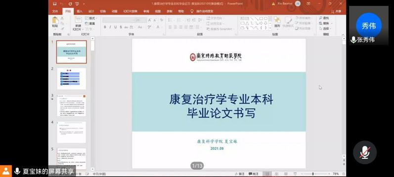 针对康复治疗学专业员工,夏宝妹老师仔细讲解了论文的基本概念、写作步骤,包括选题、搜集文献资料、设计论文框架结构等,并举出相对应的示例以便同学们参考。她还指出了毕业论文的格式要求,明确了论文与综述的区别。还特别强调“学术原创,严禁剽窃”。