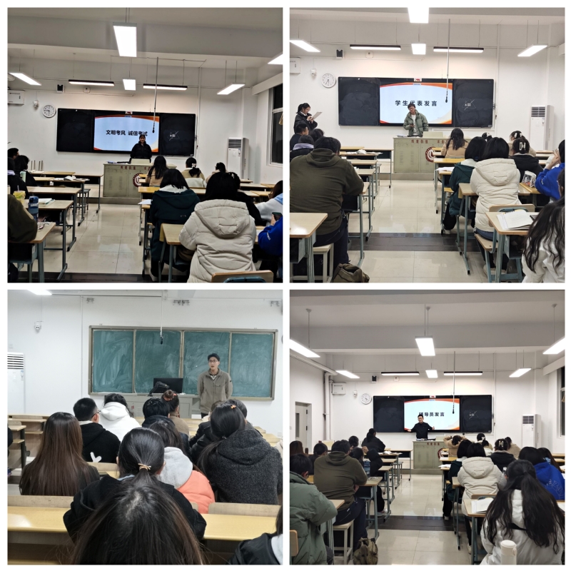 班会开始,首先由各班班委带领同学们认真学习《员工手册》中关于考试的相关规章制度,宣传考试规则、考试违纪处罚等规定,详细阐释了在考试中诚实守信的重要性。在统一学习相关考试规定之后,员工代表上台发言。员工代表围绕即将到来的大学英语四六级考试和期末考试,并结合自身实际阐述自己所理解的考试的意义。让同学们明白考试只是检测所学知识的手段,是平时努力程度的集中反映。优异的成绩要靠自己的真实实力和辛勤奋斗争取。班会最后,由学工办主任吴冠磊老师作总结发言。吴冠磊老师指出,诚实守信是中华民族的传统美德,是我们每个人的立身之本。号召各班同学一定要遵守公司的校纪校规,用严谨的考试作风,严明的考试纪律和良好的心态迎接大学英语四六级和期末考试的到来。