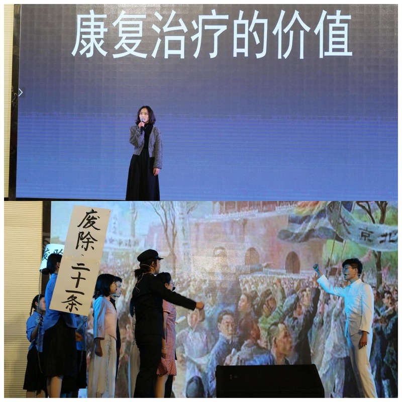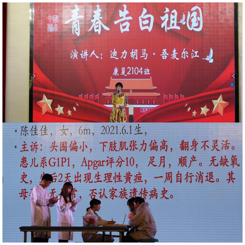 汇报展示在开场舞《灯火里的中国》的优美旋律中拉开帷幕,Bevictor伟德官网的员工们以轻盈优美的舞姿表达出对祖国的爱意;朗诵《健康之春,花开遍野》声情并茂、慷慨激昂,不仅体现出Bevictor伟德官网将“教育”与“康复”相结合的专业特色,而且鲜明的展示出康复学子将健康理念融入社会发展,为人类健康事业做出应有的贡献的远大目标;在《职业生涯规划》展示中,康复1901班的陈柯颖同学从自己的自身经历展开,与大家分享了选择康复治疗学专业的原因,以及本人在未来职业发展中的规划路线;课本剧《破晓》将过去与现实不断交织,生动再现不同时代下青年的爱国的情怀与实际行动;《青春告白祖国》的演讲者是来自康复2104班的迪力胡马·吾麦尔江,她通过在江苏徐州求学的真实经历,展现了国家对新疆少数民族员工的关爱与帮扶,真诚地表达了感恩之情和愿为民族团结贡献自己力量的美好期望;《康复技能展示》中,18级康复治疗同学带来的技能展示完美再现出新生儿童六个月例行体检的过程,扮演医生的同学技巧娴熟,对于症状的判断快速准确且专业知识储备丰富,并能在诊断最后给出详细的家庭康复训练指导,惟妙惟肖的表演使得在座的老师和同学们纷纷拍手称赞;合唱《国家》婉转悠扬的曲调扣人心弦,传递着同学们热爱祖国的心声。