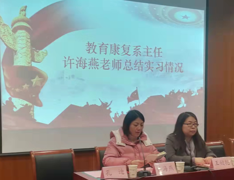 教育康复系主任许海燕老师首先介绍了2022届教康专业实习生的实习安排,总结实习工作中的人才培养亮点,充分肯定了同学们的实习成果,同时也对下学期毕业生的校内学习提出要求。许主任指出,本次实习严格按照实习大纲具体推进,同学们的进步和成长可喜可贺,实习告一段落,学习不能止步,希望同学们认真反思自身不足,有针对性的调整节奏,步履不停,再接再厉。