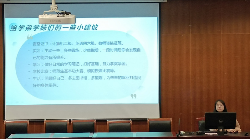12月30日下午在博韵楼114报告厅举行了2022届教育康复学专业毕业生实习总结大会。 教育康复系主任许海燕老师首先介绍了2022届教康专业实习生的实习安排,总结实习工作中的人才培养亮点,充分肯定了同学们的实习成果,同时也对下学期毕业生的校内学习提出要求。接着,在特殊教育公司、康复机构和普通公司等不同实习单位的五位优秀实习生代表依次进行了汇报发言。他们将实习经历以文字、图片和视频的方式进行呈现,从教学工作、班级管理、个人体悟等方面对自己的实习情况做出展示,他们希望通过自己微薄的力量,帮助更多的特殊儿童走向社会、融入社会。最后,公司王姣艳副经理发表总结讲话。她强调,教育康复学专业是师范类专业,同学们一定要加强自身师德教育,重塑特殊儿童教育观,从教后务必以博爱情怀关心关爱特殊孩子,时刻进行自我反思和自我成长。2019级员工要以优秀实习生代表为榜样,保持进取之心,提前做好职业规划和相关准备工作,同时祝愿2022届员工顺利就业,找到理想去处!