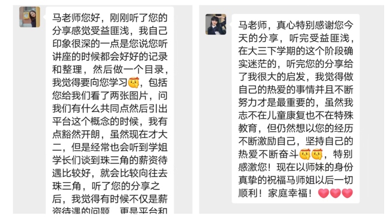 讲座中,马善波老师从“公司产品”、“生涯规划”和“特色创新”三个方面分享了自己的工作经历以及个人成长经验。马老师自毕业起就一直扎根在特殊教育工作的一线。她讲到,在公司产品中要做到“脑中有纲、目中有人、心中有数”,在生涯发展中要“把握关键人物、重视关键事件、熟读关键读物”,在特色创新中要善于利用“无中生有、人无我有、人有我优”三个策略。马善波老师提到,目前党和国家高度重视特殊教育,从“关心”到“办好”,特殊教育大有可为,前景光明。作为未来的特殊教育行业从业者,同学们应顺应时代发展,成己为人、成人达己。讲座的最后,同学们积极与马善波老师互动。马善波老师讲座的语言朴实生动、内涵丰富,受到了同学们的热烈欢迎。