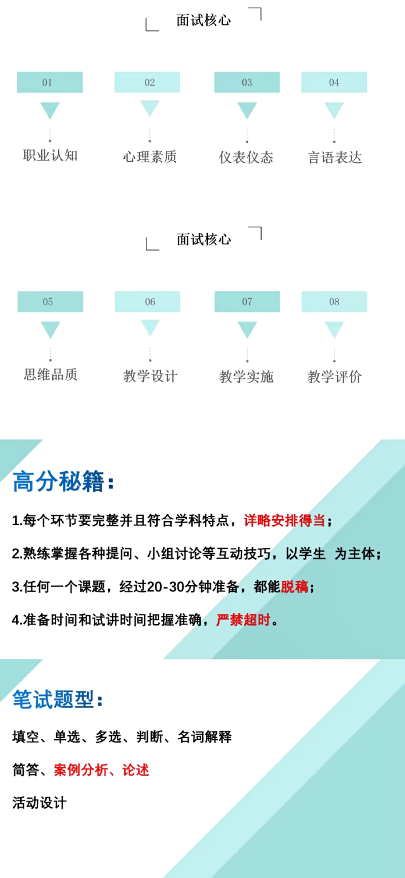 在面试方面,杨老师主要对面试的四大模块进行了一一讲解:回答规定性问题、说课(试讲、模拟课堂)、答辩、专业技能。其中还对说课、试讲、模拟课堂的差异在对象和内容方面进行了分析对比。然后杨老师提出了面试的八大核心:职业认知、心理素质、仪表仪态、言语表达、思维品质、教学设计、教学实施、教学评价。在这八大核心中,杨老师着重指出职业认知、心理素质、仪表仪态这三大核心,并称其为“0成本的高分回报”。最后,杨老师针对面试给出了四条高分秘籍。