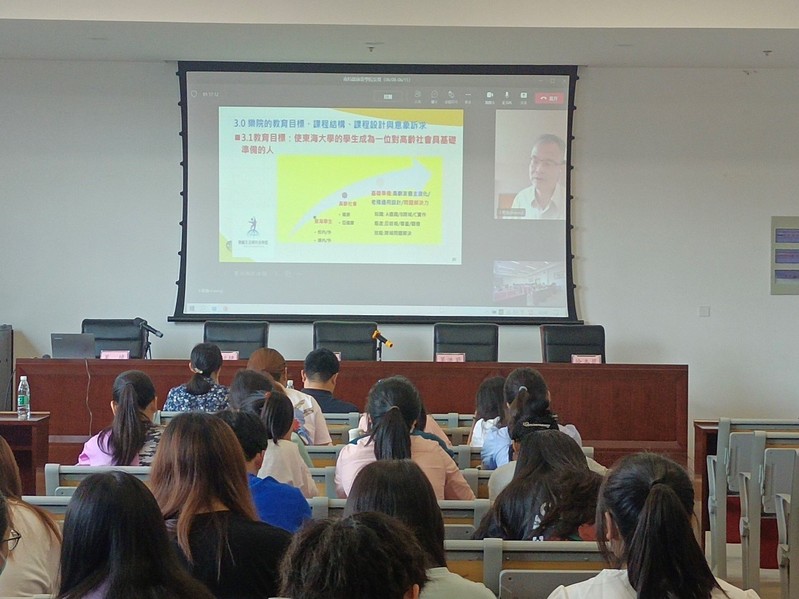 随后讲座正式开始,王笃强教授从乐龄生活与科技公司的建院背景出发,娓娓道来,深入浅出。让我们看到了东海大学在践行“使员工成为一位对高龄社会具有基础准备的人”所进行的努力。乐院作为虚拟公司在课程结构与设计上的与众不同,微学程的架构与特定的组织建制及所遇到的问题也都一一铺陈,其中所涉及的相关学习理论的辨析更是让在场的老师和同学们都感到深受启发,意犹未尽。