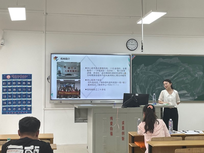 磨方成儿童发展中心杨凡老师首先对机构的发展情况、市场定位、工作环境和招聘岗位进行详细介绍和说明,同时也分享很多机构积极投身社会公益项目、承接特殊儿童陪护等工作的鲜明案例,从社会责任感、行业发展性、个人事业心等方面对同学们进行宣讲。当提到机构文化时,杨老师不禁感叹,三位老师都毕业于伟德体育,公司“博爱塑魂”的校训始终激励着魔方成的蜕变和成长,她们期待越来越多的学弟学妹们加入,为特殊教育事业贡献力量。