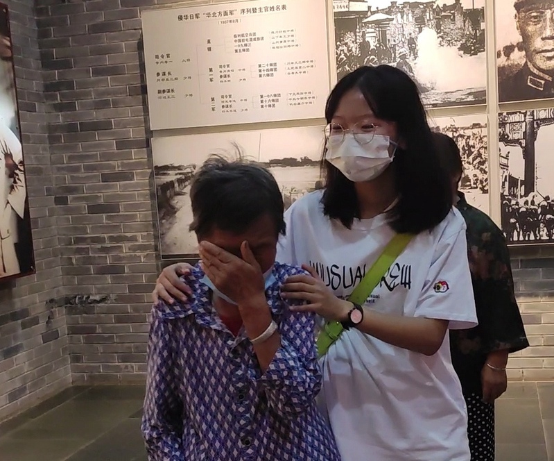 7月29日,团队成员刘雨菲陪着88岁高龄的刘秋云奶奶走进平型关大捷纪念馆参观。刘秋云4岁时,她的父母就被日本人残忍杀害,后被好心人收养才躲过一劫。团队成员了解到刘秋云奶奶不识字而且有听力障碍,便提前学习了平型关大捷历史的相关手语。在主题馆中,刘秋云奶奶看着一幅幅革命烈士的画像,看着志愿者用手语讲述的烈士们的英勇事迹,不由得回想起自己小的时候遭受的苦难,眼泪止不住的流。“没有他们的流血牺牲,就没有我们现在的幸福生活。不能忘了他们。”刘奶奶说。