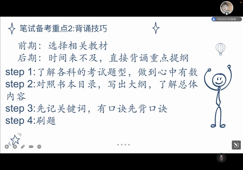 本次讲座邀请了公司1905班陈琦同学担任主讲人。陈琦同学成绩优异,并在2021年一次性通过了教团队格证考试的笔试和面试。陈琦同学围绕笔试部分的《综合素质》、《公司产品知识与能力》及面试部分的报名流程、考试内容两大模块进行经验分享,从重点难点、学习途径、解题思路、时间分配进行详细讲解。陈琦同学强调,无论是笔试还是面试,一定要带入教师的视角去答题。