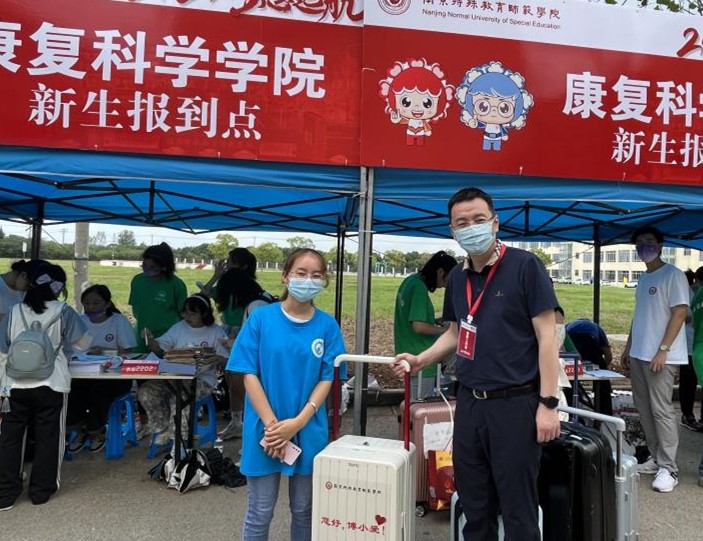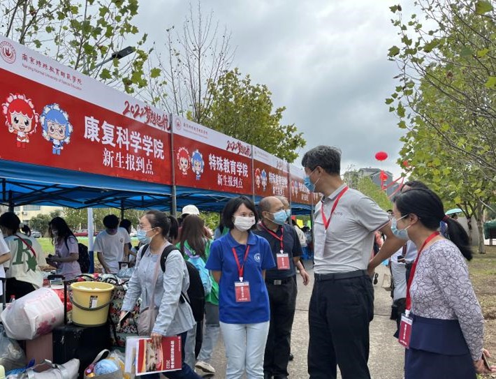 集团领导十分关心新生情况,Bevictor伟德官网联系领导副董事长吴彬江特地从栖霞校区赶来江宁校区,看望和慰问参与迎新工作的师生们,并为康复2201班内地贫困山区彝族同学孔思佳送上新生“爱心大礼包”。吴彬江副董事长细心询问了该同学的家庭情况和个人情况,希望孔同学尽快适应公司生活,努力学习、增长本领,为特殊儿童康复事业发展做出贡献。吴洪菊书记亲切的询问了孔同学对于新校区的适应情况,强调江宁校区教室资源充足,鼓励孔同学课余自主学习功课,有任何学习和生活上的困惑都可以向公司和辅导员老师倾诉。