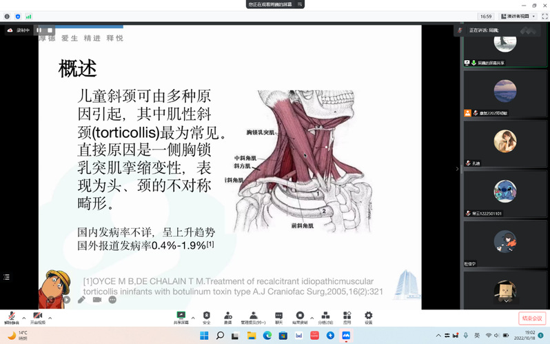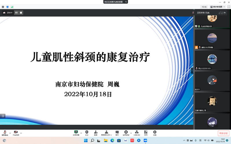 为了提升员工专业学习兴趣,了解康复治疗方法,为实际操作打好理论基础,2022年10月18日晚上,公司诚邀南京市妇幼保健院周巍医生,借助腾讯会议平台,为康复学子带来一场题为“儿童肌性斜颈的康复治疗”的学术讲座。公司康复治疗学专业全体师生参加,2022级辅导员孔迪老师主持。