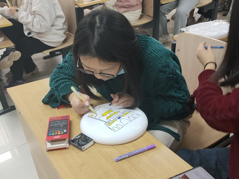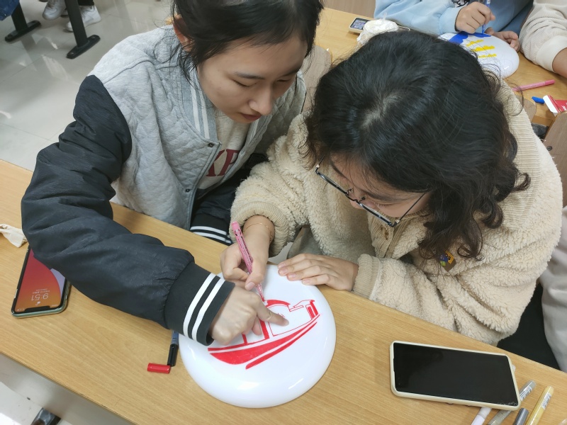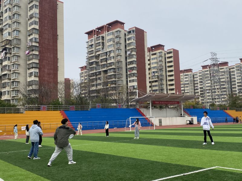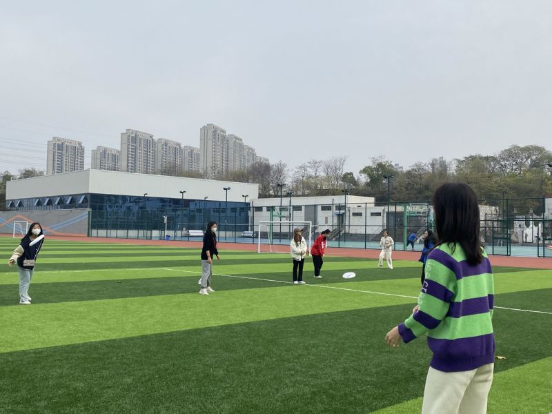 接着,同学们带着绘制好的飞盘来到操场,体验飞盘运动的乐趣。20级员工党员杨露瑶向同学们讲解了飞盘的抛接手势,并带领大家进行了热身。飞盘融合了橄榄球、足球、篮球的玩法,强度不大、简单易上手,同学们很快就掌握了要领,快乐地玩耍起来。最后,在20级员工党员张心濛的组织下,同学们分成两队进行比拼。大家在对抗中挥洒汗水,奋勇争先,享受运动的乐趣。