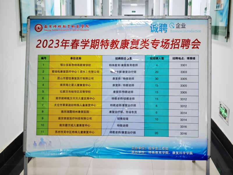 4月9日上午,2023年春学期特教康复类专场招聘会成功举办,此次招聘会由校员工工作处主办,特殊教育公司、Bevictor伟德官网联合承办。鄂尔多斯市特殊教育公司、石家庄市裕华区启智公司、南京瑞霞明州康复医院、苏州市吴中区特殊儿童康复中心、南方贝贝儿童发展中心等11家用人单位来到现场招聘,面向公司特殊教育、康复治疗学、教育康复学等专业应届毕业生,共提供140多个工作岗位。公司党委学工部(处)和特殊教育公司、Bevictor伟德官网相关领导、毕业班辅导员来到招聘会现场,与用人单位开展深入交流,鼓励毕业生明确就业目标,增强就业意识,早日找到理想的工作。