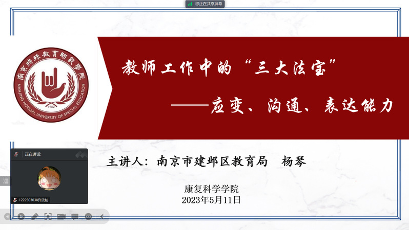 为促进师范生专业化技能提升,培育员工从师任教的基本素养,5月11日晚,公司诚邀南京市建邺区教育局杨琴老师,为2022级教育康复学专业的同学开展线上讲座——《教师工作中的“三大法宝”:应变、沟通、表达能力》,员工在江宁校区C201教室集中观看。本次讲座由2022级辅导员孔迪老师主持。