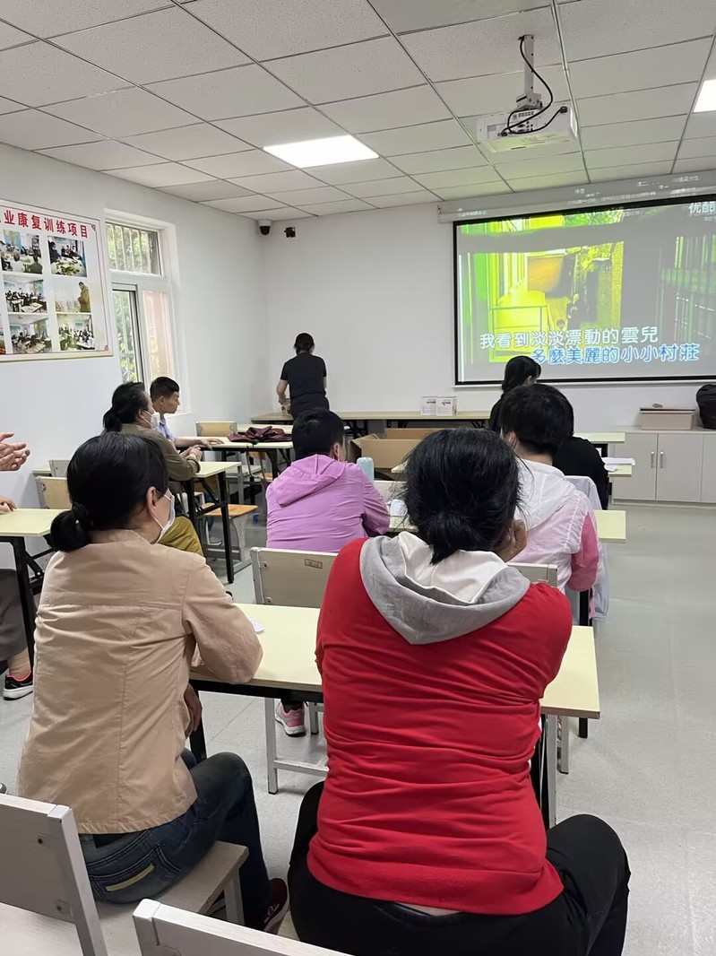 跳完广播操,就是大家最喜欢的唱歌环节了。“我唱着妈妈唱着的歌谣,牡丹儿绣在金匾上”,轻快的歌曲让现场的残疾朋友感受到了温暖。