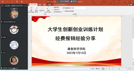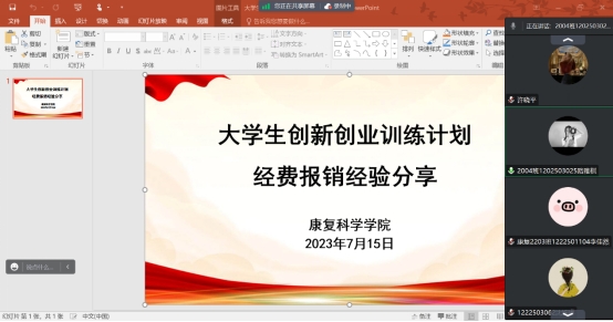 部分同学反馈不知如何有效使用及报销大创经费,为解决该问题,本次会议邀请了本公司两位有效使用大创项目经费的同学进行经验分享。两位同学为大家描述了各自报销时的流程、注意事项及可能遇到的问题,给未报销过的同学提供参考。会议结束后,管理员老师将会议录制视频分享在交流群中供同学们重复观看。