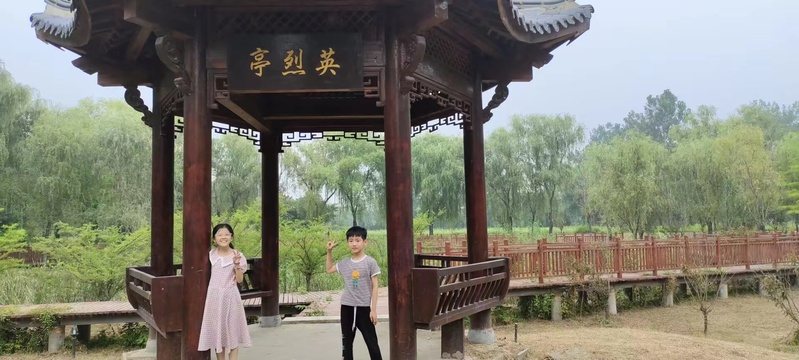 活动开始,“寻找红色基因”拍照打卡环节迅速点燃了孩子们的热情。团队成员们向孩子们发放了打卡题卡。题卡上有的印着板桥集抗日战争纪念碑,有的印着曾经参加过板桥集战斗的百名将军题词,有的印着公园里展出的飞机模型。孩子们按照分组,根据照片的提示,找到对应的地点拍照打卡。“快点,我记得王安石碑在英烈亭的前面!”话说着,孩子们已经冲向前去,“还有青年林!在那边的小路旁!”“小朋友们,你们还记得纪念碑在哪吗?”团队成员徐可问道,“在里面!还要往里走!靠近一个大门那边!”奔跑的身影、欢快的笑声,快乐的气氛弥漫在整个公园。
