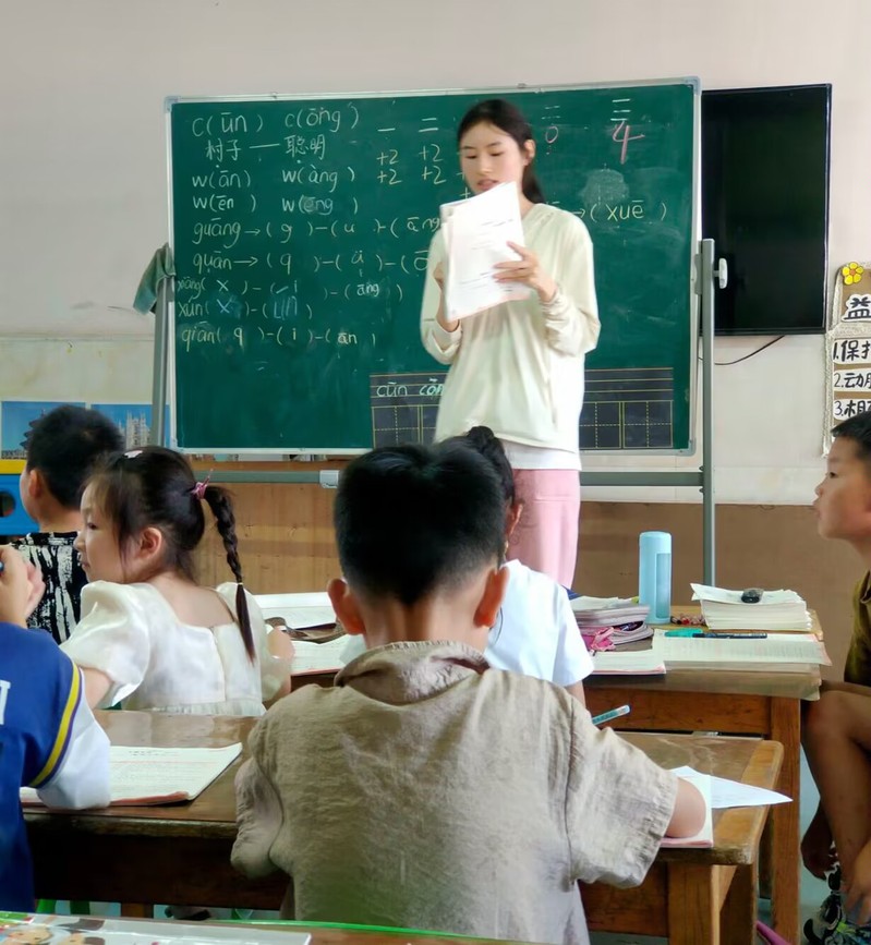 参观完校园,团队成员分组进入不同班级观摩课堂教学,了解孩子们的学习情况。观摩学习后,团队成员们分组开展实践。有的对学习有困难的员工进行个别辅导,有的给孩子们带来了生动有趣的语文课,孩子们跟着老师的板书学习拼音。