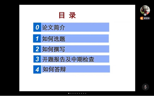 夏宝妹老师从论文简介、如何选题、如何撰写、开题报告及中期检查和如何答辩5个方面介绍了本科毕业论文的撰写,接着对论文选题、摘要、关键词、文献综述、研究设计、参考文献等方面进行了具体的讲解与说明,帮助同学们进一步熟悉毕业论文写作流程,理清如何写好毕业论文的思路,解决了同学们在毕业论文写作中面临的主要困惑。