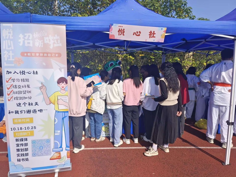 为宣传社团文化,发扬社团精神,公司举办“百团大战”社团文化宣传活动,悦心社秉持着“守望心灵,悦纳自己”的理念、怀着认识与了解新同学的美好期望,分别在栖霞和江宁两个校区开展了此次“‘悦’动青春,‘心’向未来”社团招新活动,在悦心社全体成员的共同努力下,活动于10月29日圆满结束。