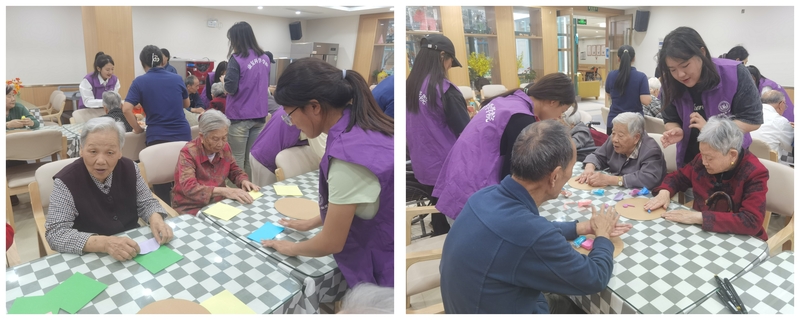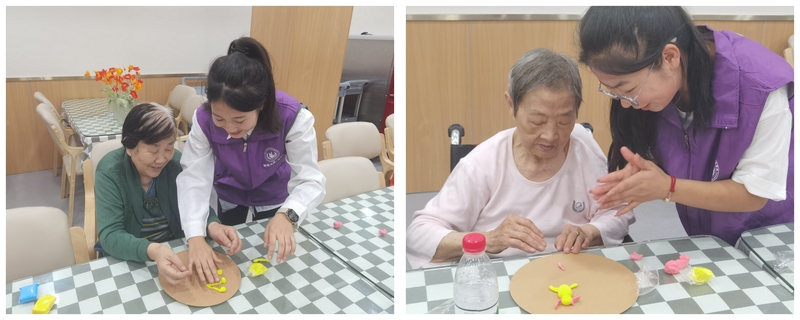 活动中,志愿者们为老人们表演了诗歌朗诵,带领老人们开展了折纸与黏土画制作等活动。“奶奶,您真是太棒了,花做的特别漂亮!”“奶奶,您折的太好了,给您点赞!”在志愿者的带领下,老人们充分发挥想象力进行手工DIY,完成了一件件生动有趣的作品。“爷爷,您捏的是家里养的小鸡吧?”“是的啊,年轻的时候家里养了不少。像不像?”李爷爷得意的说。“像、真像!”大家纷纷应和道。温馨欢快的气氛晕染了整个活动室,看到老人们灿烂的笑容,听到老人们爽朗的笑声,志愿者们也充分体会到了本次活动的意义所在。