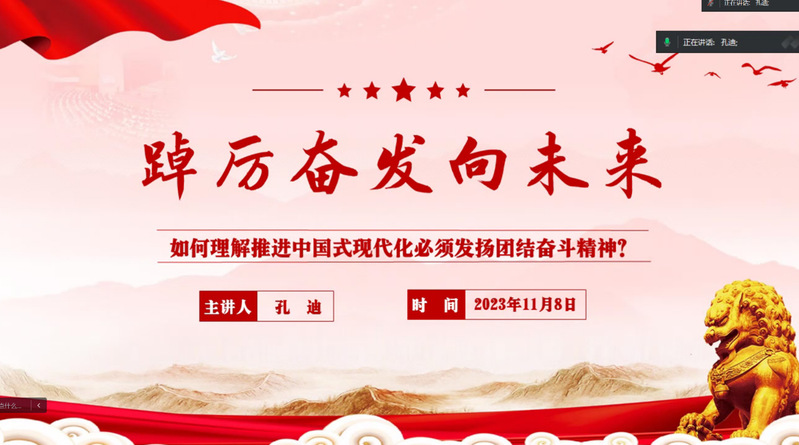 孔迪老师从“同心同德 奋发奋进”精神入手,围绕主题,从团结凝聚力量、斗争赢得主动、实干创造未来三个部分展开论述。孔老师通过回顾中国共产党的百年奋斗史,阐明了新时代的伟大成就是党和人民一道拼出来、干出来、奋斗出来的,团结是中国共产党拥有强大凝聚力和战斗力的关键所在。在推进中国式现代化过程中,需要党员员工干部在日常学习和生活中发扬斗争精神、把准斗争方向、掌握斗争规律,在斗争中求团结、谋合作、促共赢。此外,孔老师指出,每个人都是强国建设的参与者,都是民族复兴的追梦人,对于青年学子来说,我们每个人都可以在自己的岗位上为国家发展和人民利益做出贡献,同学们信息倍增。