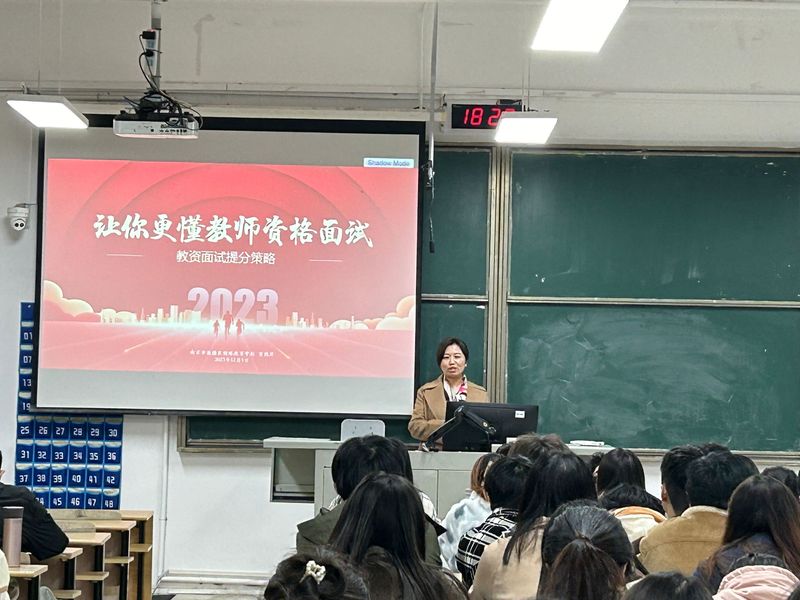 黄艳萍副董事长为中小学高级教师,现任南京市鼓楼区特殊教育公司副董事长,南京市鼓楼区特殊教育指导中心办公室副主任,曾获南京市学科教学带头人、南京市优秀青年教师等荣誉。黄艳萍副董事长从教团队格证面试的基本情况、结构化面试、教学试讲以及现场答辩等四个方面详细地讲述了教资面试的整个过程。同学们聚精会神听讲,认真思考黄艳萍副董事长所提出的问题,并与老师进行积极互动。在讲解结构化面试的过程中,黄艳萍副董事长所提出的五个阶段方法为同学们复习结构化面试提供了很好的借鉴和参考。