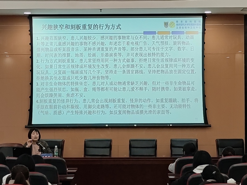 颁奖仪式结束后,南京脑科医院儿童心理卫生研究中心主任医师王民洁教授,作题为《孤独症谱系障碍早期发现和早期干预》讲座。王民洁教授从孤独症谱系障碍的核心障碍、诊断演变、流行病学等多方面为同学们进行了详细的介绍与讲解,丰富了同学们的专业知识储备。