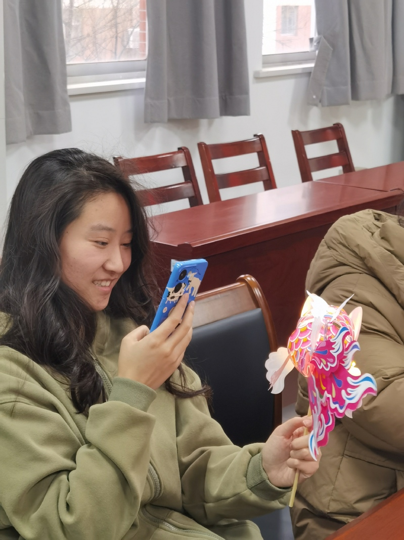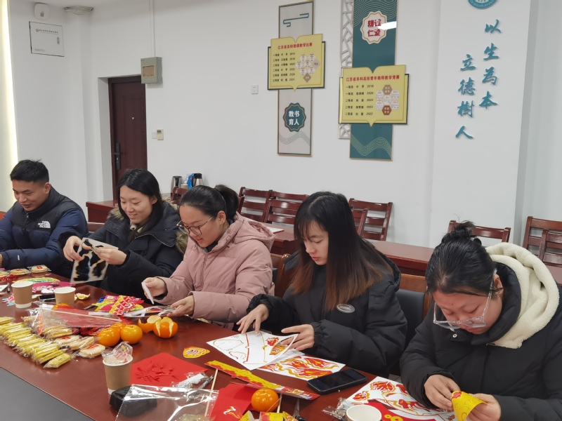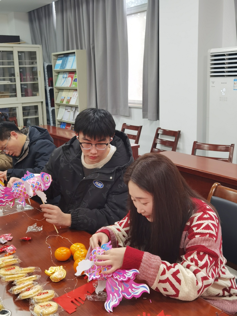茶话会在轻松愉快的气氛中进行。在《剪春花》、《做鲤鱼灯》等活动环节中,同学们体验传统民俗,用灵巧的双手剪刻出美丽的春花图案,制作出栩栩如生的“年年有余”鲤鱼灯,欢欢喜喜迎新春!