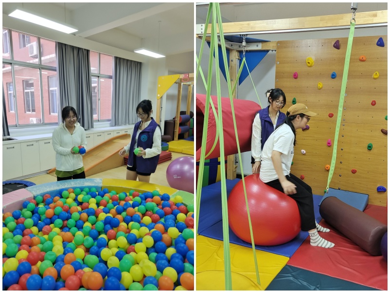 走进感觉统合实验室,就如同走进了儿童乐园。这里的秋千、平衡板、滑梯、大龙球吸引着参观者的目光。“通过这些教具,可以训练和改善特殊儿童感知能力。比如这个滑板车,孩子俯卧在上面,四肢抬起模仿‘小飞机’,可以刺激他的前庭平衡和本体知觉,从而提高他的控制能力。”志愿者详细介绍到。听了志愿者们的讲解,同学们纷纷发出赞叹,原来“小”玩具也有大作用。
