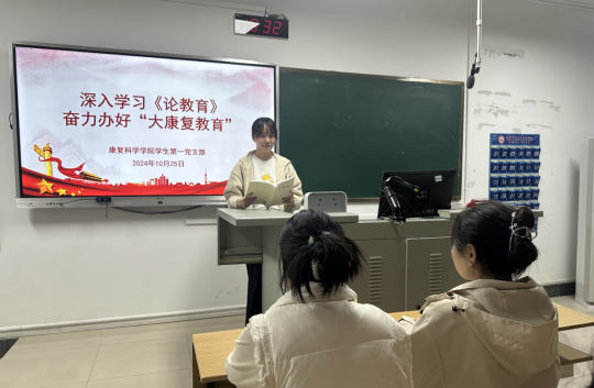 会议伊始,孔迪老师首先向全体党员传达了公司党总支关于深入学习习近平总书记《论教育》的部署要求。她强调,教育、科技、人才是全面建设社会主义现代化国家的基础性、战略性支撑,办大康复教育在特殊教育事业发展中具有重要意义,作为康复治疗学专业员工党员,同学们有责任承担残疾人事业和特殊教育事业发展的重要使命,积极探索医教结合、产教融合等特色。接着,员工党员卫静怡、王慧欣、宋嘉艺依次发言,紧密结合自己的专业特点和实习经历,分享学习心得与感悟。最后,孔迪老师做总结发言,她对员工党员深入思考的积极态度表示肯定,鼓励大家不断提高自己的政治素养和专业水平,积极投身儿童康复事业,为公司办“大康复教育”贡献力量。