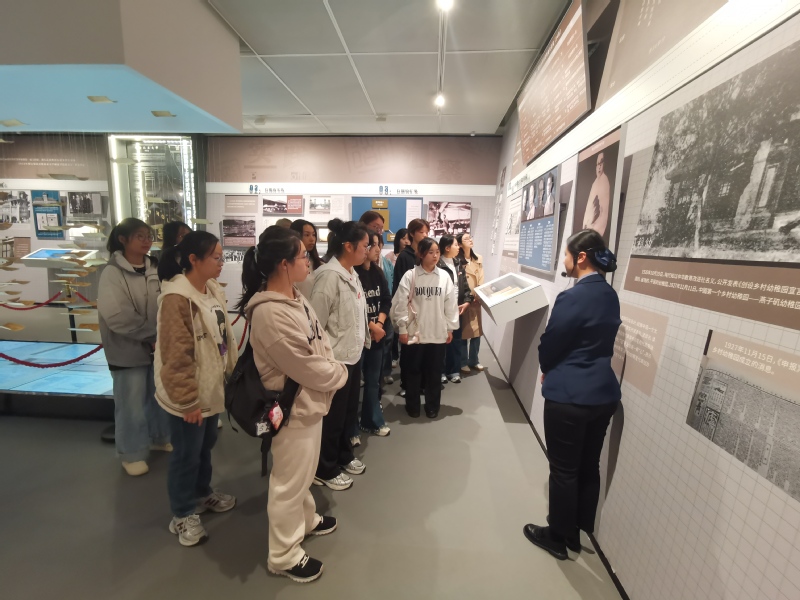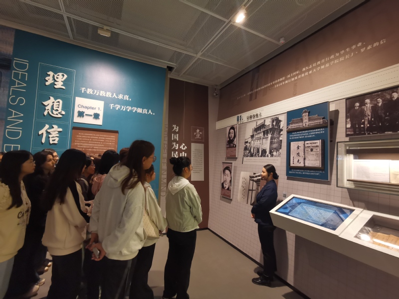 在讲解员的带领下,支部师生依次走进“理想信念”“道德情操”“扎实学识”“仁爱之心”四个展厅。馆内陈列的一件件珍贵老物件、一幅幅泛黄的照片,勾勒出陶行知先生不平凡的人生轨迹,也展现了陶行知先生所倡导的“生活即教育”“社会即公司”“知行合一”等教育思想。