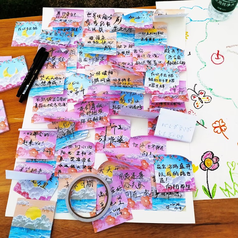 在“传递祝福”环节,同学们一起写下对残疾人士的关爱与鼓励。这些卡片将由公司青协的志愿者们送到各个志愿服务点,将同学们的心意带到残障人士身边。