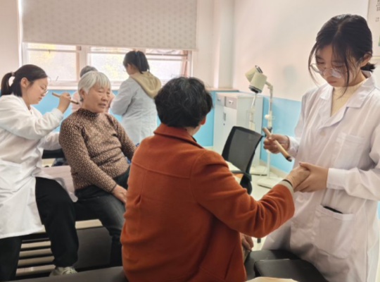 传统康复体验也是本次活动的一大亮点,党员员工干部运用课堂所学的推拿、艾灸技术,为颈肩腰腿疼痛的老人提供理疗服务。“小姑娘找准穴位轻轻一按,我这肩膀立马松快多了!”正在接受推拿的张爷爷竖起大拇指。艾灸体验区更受瞩目,艾草的清香与融融暖意交织成独特的风景。志愿者们提前备好艾条、灸盒、温灸器等专业工具,操作前,他们逐一询问老人身体状况,为患有高血压的赵奶奶调低艾灸温度,替膝关节肿胀的周爷爷改为远端穴位施灸,严谨细致的作风获得在场老人一致好评。
