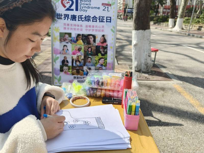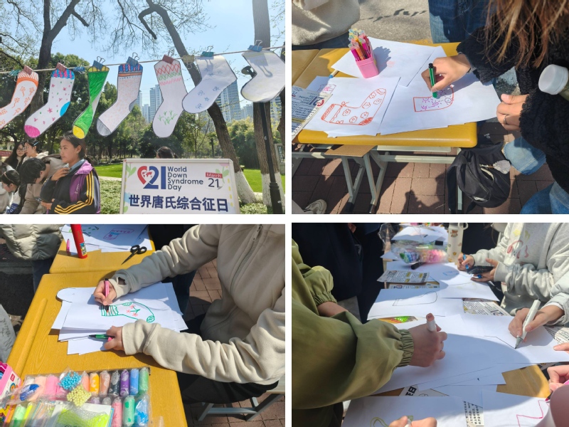 为增强同学们的参与感,活动现场开展了“画两只不同的袜子”活动。志愿者李蕊解释道:“两只不同的袜子象征着唐氏综合征患者第21条染色体的独特性。我们希望通过这种方式让大家明白,不同并不意味着怪异,也可以充满创意与乐趣。”活动现场气氛热烈,同学们纷纷拿起画笔,用心绘制两只不一样的袜子,以表达对唐氏综合征患者的理解与尊重。