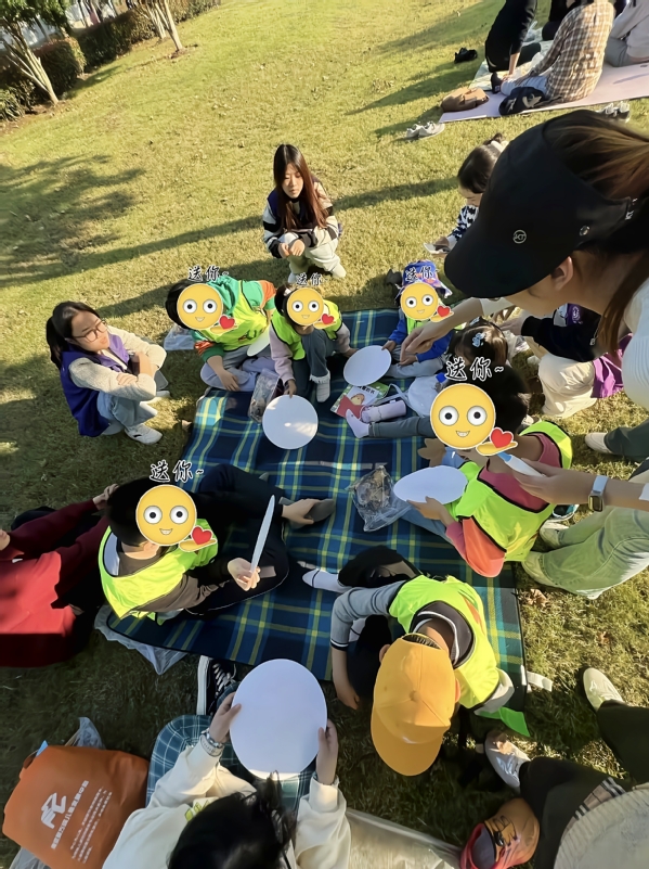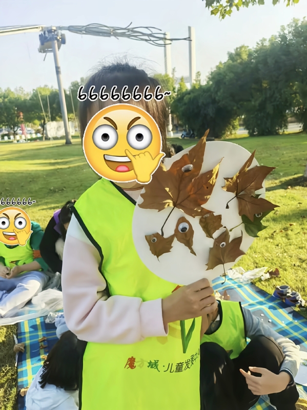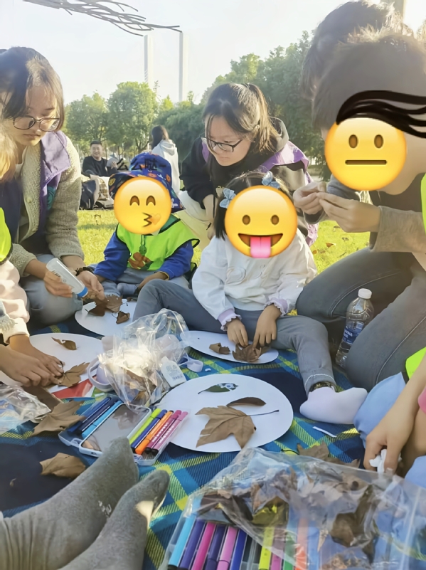 到达公园后,一场充满创意的自然美学之旅开启。“拾一片落叶,解锁自然赠予的盲盒惊喜!”在阳光的照耀下,孩子们无需画笔,就能用落叶创造出独特的艺术作品。他们和志愿者一起,为树叶点上眼睛,赋予它们生命。孩子们积极动手,小脸上满是专注与认真。