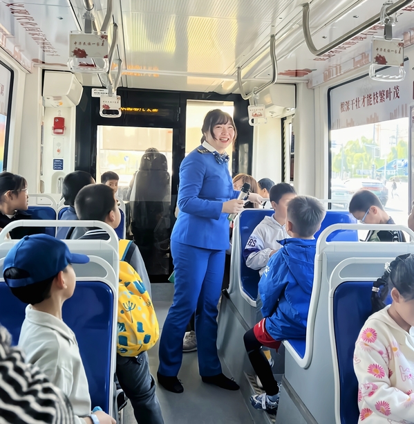 清晨,一辆有轨电车缓缓驶来,载着这些特殊的小乘客驶向鱼嘴湿地公园。在电车上,孩子们听着工作人员介绍电车线路和历史,感受城市的进步,脸上洋溢着期待的笑容。