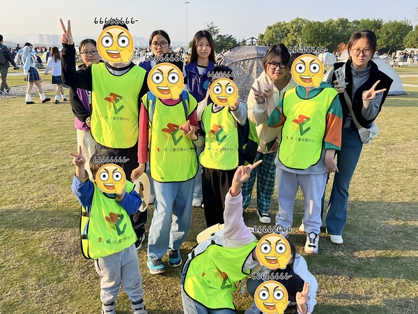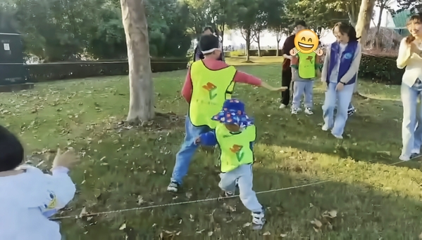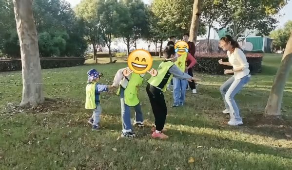 随后,孩子们戴上神秘面具,化身勇敢的小将,在皮筋圈出的“领地”内,根据志愿者的拍手声和呼喊声辨别方向,小心翼翼地移动。声音忽左忽右,考验着他们的感知力与专注力。孩子们的欢笑声在草地上久久回荡。