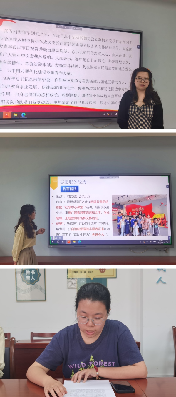 随后,康复2106班的于小雅同学以“乡村振兴中的青春足迹”为题,分享了她在大学期间的志愿服务经历。她表示,志愿服务让她在实践中体会到了奉献的快乐,坚定了服务社会的决心,并呼吁更多青年学子加入志愿服务,为乡村振兴贡献力量。康复2105班的热则古丽·热伊木同学则以“西部计划:我的青春与梦想”为主题,分享了自己对西部计划的理解和认识。她讲述了自己参与西部计划招录的经历,以及在家乡“红领巾小课堂”中担任国语辅导老师、开展文化服务工作的点点滴滴。正是这些经历,在她心中种下了返乡建设家乡的坚定信念。她表示,要以习近平总书记的回信精神为指引,继续为家乡发展贡献力量。