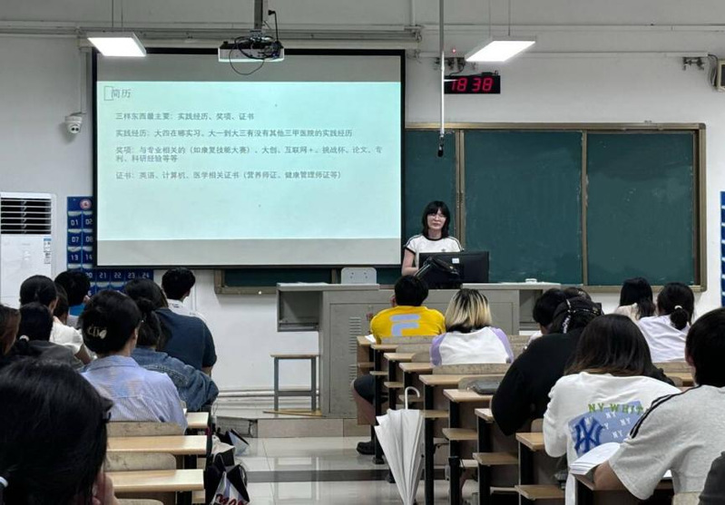 李昭帼、鲁淑慧、宋嘉艺三位毕业生依次登台交流。李昭帼从自身备考经历入手,深入剖析当前康复治疗学专业员工在求职道路上面临的挑战。考入石家庄市启智公司的鲁淑慧则聚焦“平衡实习和学习”这一议题,鼓励同学们在实习过程中全身心投入康复实操技术提升。成功入职深圳市宝安区特殊教育公司的宋嘉艺,围绕“教资-实习-论文-就业”四步走,希望学弟学妹们提前为就业做好全方位准备。