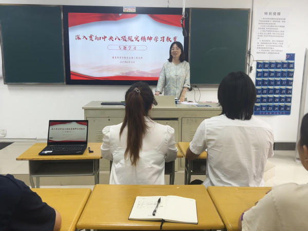 活动伊始,支部书记王雪梅老师领学了习近平总书记重要文章《锲而不舍落实中央八项规定精神,以优良党风引领社风民风》。文章深刻阐述了中央八项规定精神的核心要义和重要意义,强调了作风建设的长期性和艰巨性。王雪梅老师指出,员工党员作为校园文化建设的重要力量,应以优良的学风和教风为引领,自觉践行党的优良作风。随后,两位员工党员代表结合自身学习和生活实际,就如何在教风和学风建设中贯彻落实中央八项规定精神进行了深入的研讨交流。张雨欣同学分享了自己在学习过程中如何保持勤奋刻苦的态度,抵制不良学风的侵蚀;朱音同学则从特校实习经历出发,谈到了如何在日常教学活动中以身作则,树立良好的教风,为员工树立榜样。