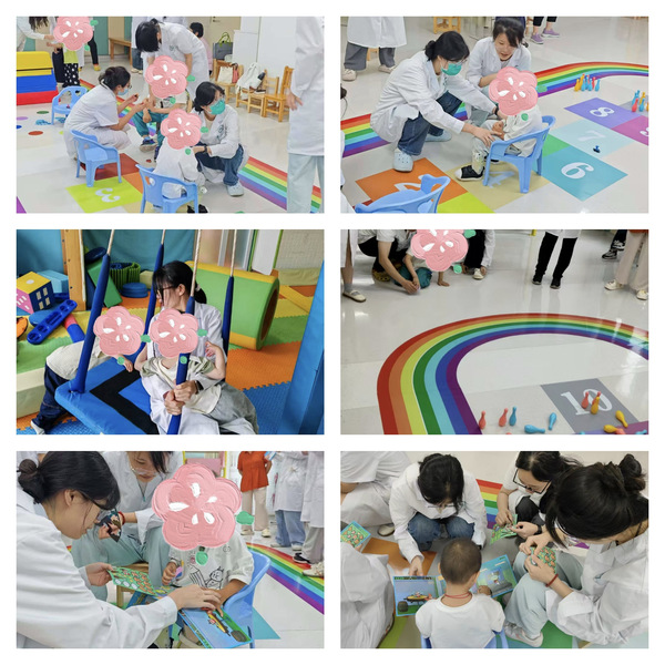 团队成员分组深入精神运动治疗室、作业治疗室(OT)、物理治疗室(PT)、密集训练室等核心康复科室进行轮岗实践。在带教老师的悉心指导下,成员们成功实现了从课堂观察者到临床实践者的角色转变。他们系统观摩了针对运动障碍、孤独症谱系障碍等不同需求儿童的专业评估流程与个性化干预方案的制定过程,并在严格监督下辅助开展运动疗法、感觉统合训练等基础治疗工作,有效促进了理论知识向实操技能的转化。同时,团队成员深刻体会到物理治疗(PT)、作业治疗(OT)、精神运动治疗等多学科团队(MDT)协作在儿童康复中的关键价值。