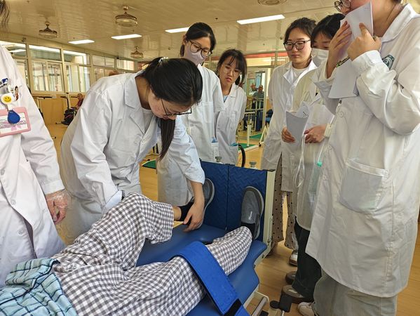 实践中,“心肺康复行”团队首要任务是协助基层医疗机构康复治疗师开展手法治疗。在指导下,学子们精准执行关节活动度训练、神经促通技术等治疗方案,实时记录患者反应。同时,团队向患者家属普及康复知识,通过图文手册、现场演示等方式讲解家庭护理要点与并发症预防,并关注老年患者心理状态,在互动中体会“康复需技术更需关怀”的内涵。